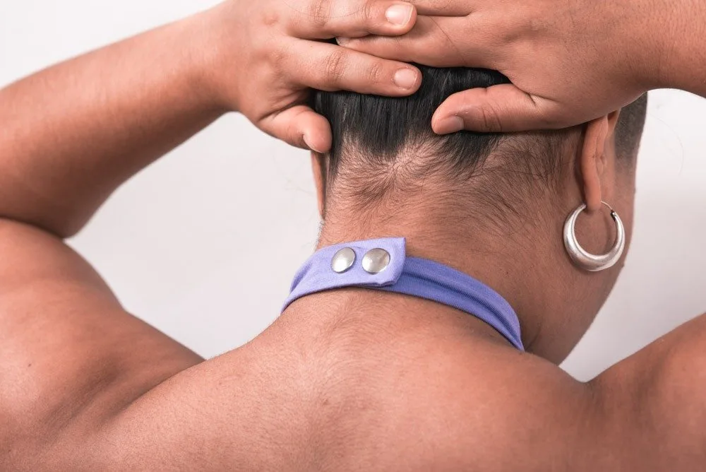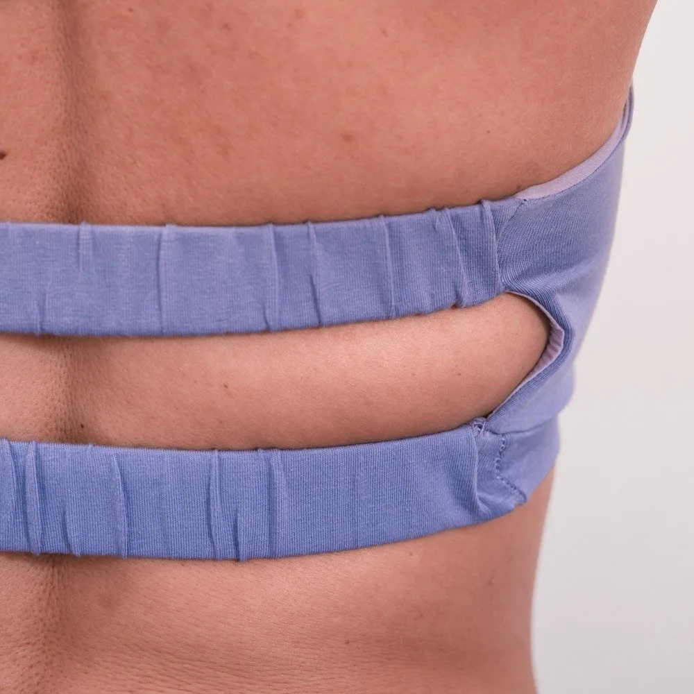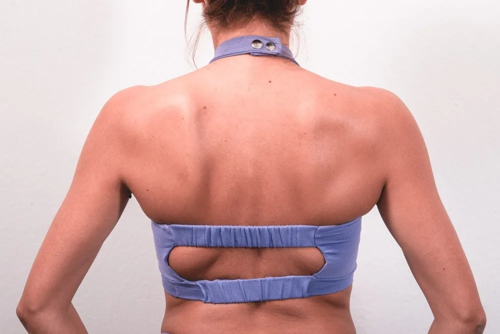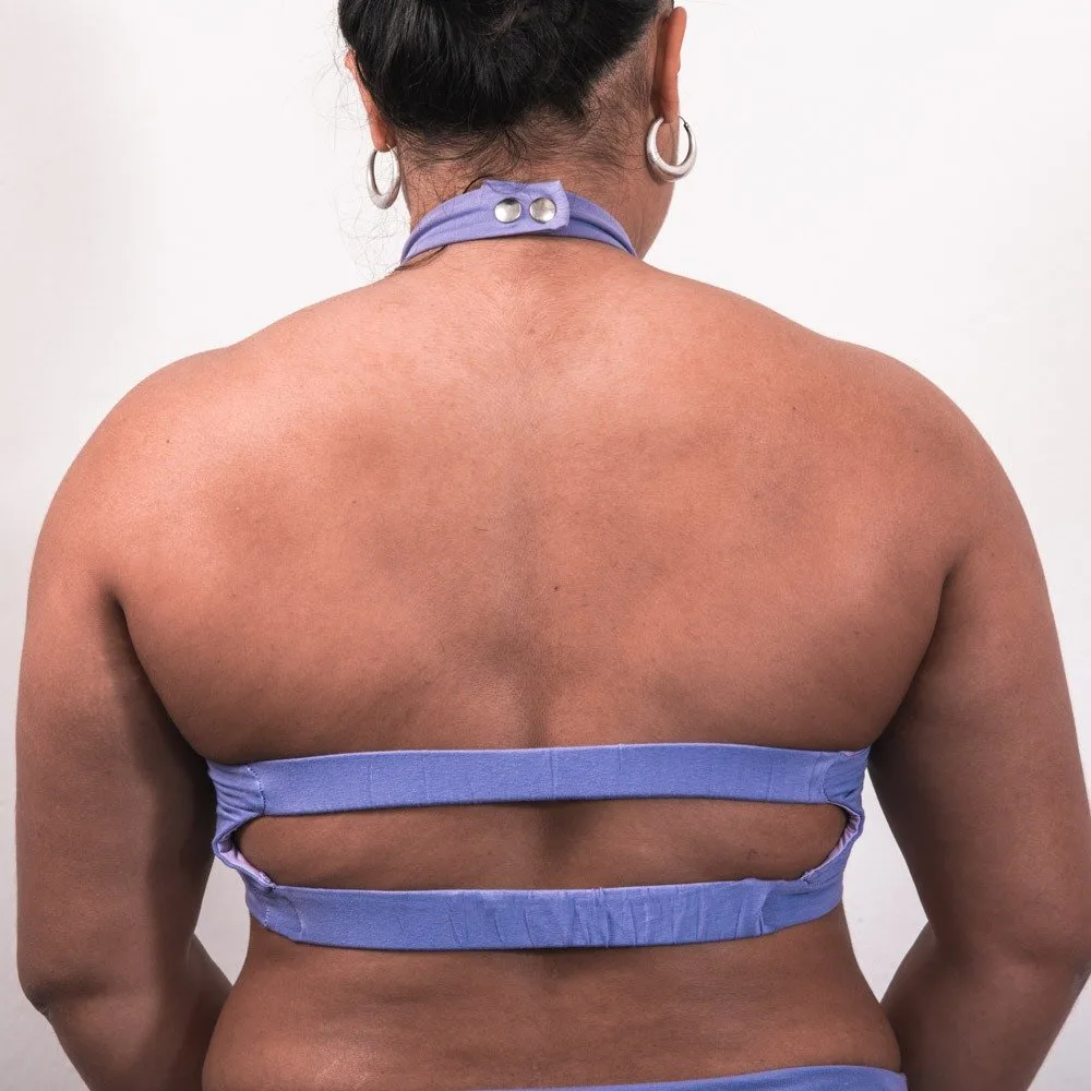 Top a collo alto con schiena e spalle scoperte con doppi elastici sul retro.